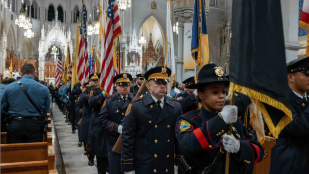 Cardinal Joseph W. Tobin, the Archbishop of Newark, presided over the liturgy at the Cathedral Basilica of the Sacred Heart, which began with a procession of police honor guard units presenting national, state and police flags as well as a performance by an accompanying pipe and drum unit.
