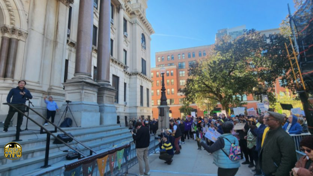 The Knitty Gritty JC Social Club organized a “No Kings Day” rally against President Donald Trump (R) at Jersey City City Hall, a part of a national effort that was headlined by remarks from U.S. Senator Andy Kim (D-NJ).